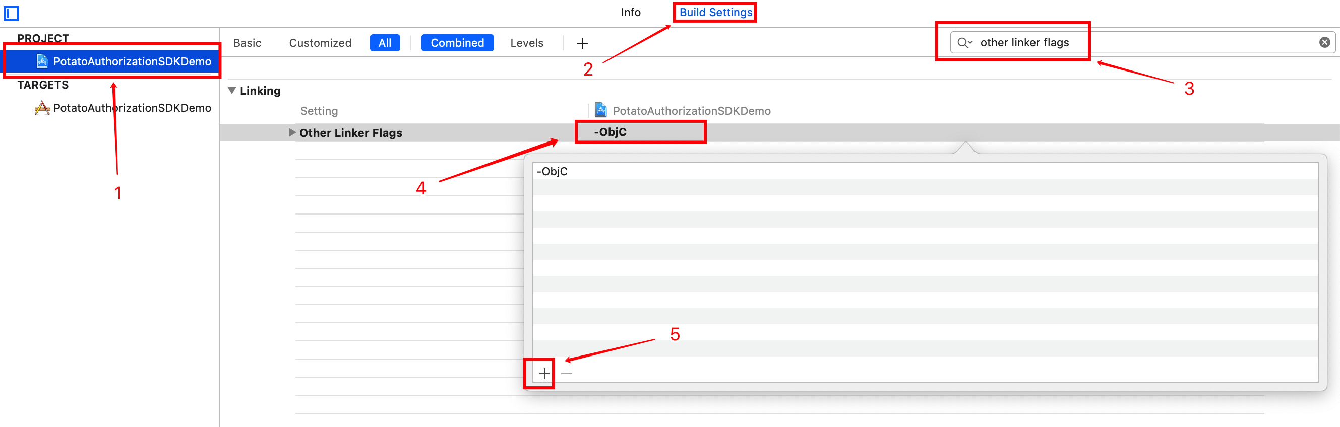 2 Find the current SDK where the project corresponds to the Other linker flags option to add â-ObjCâ, as shown below: