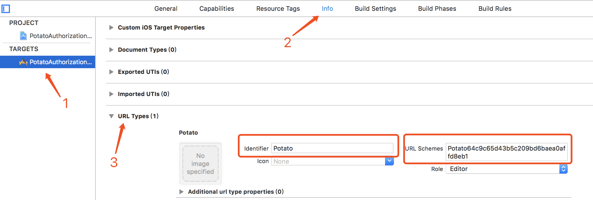 3 Configure urlscheme in your own project, the identifier is Potato, and the scheme is Potato+ClientID as shown below: