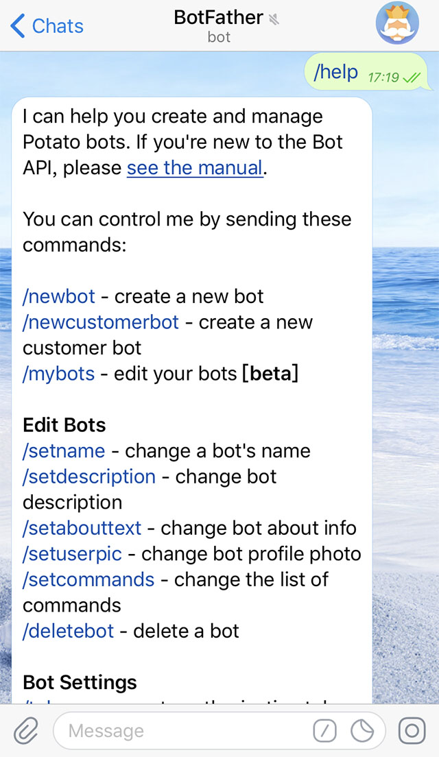 Whenever your bot sends a message, it can pass along a special keyboard with predefined reply options (see ReplyKeyboardMarkup). Potato apps that receive the message will display your keyboard to the user. Tapping any of the buttons will immediately send the respective command. This way you can drastically simplify user interaction with your bot.