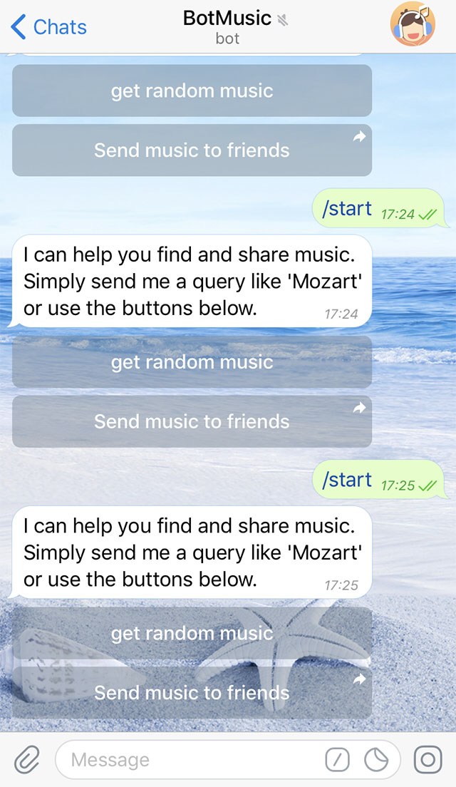 When callback buttons are used, your bot can update its existing messages (or just their keyboards) so that the chat remains tidy. Check out these sample bots to see inline keyboards in action: @music, @gif, @sticker.
