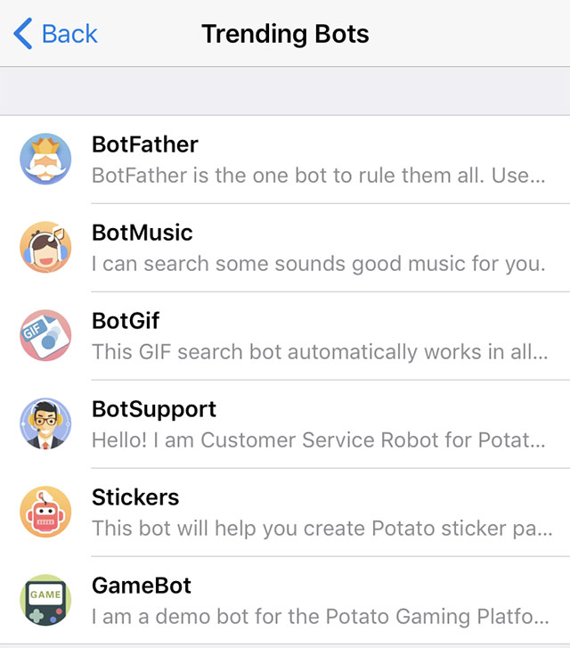 Then click on the Bots Mall, it will present official Potato bots there, like @GIFBot, BotMusic, and BotGif, etc. After being approved, the third-party bots can be also presented in the Bots Mall.